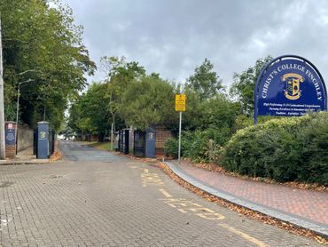 When you enter the gates of the school proceed to the end of the drive as far as you can go. You will cross over a mini roundabout and find some parking. The dining hall is in the main building on the left hand side.